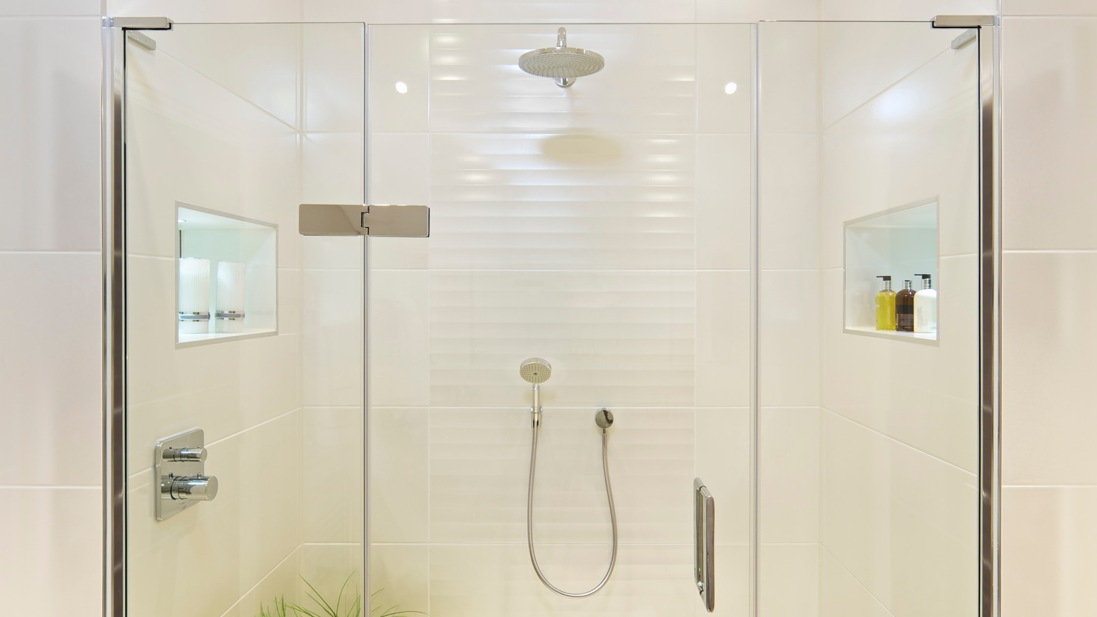 • Recessed corner shelves replace bulky shower caddies, keeping shampoo bottles and toiletries organized without taking up room